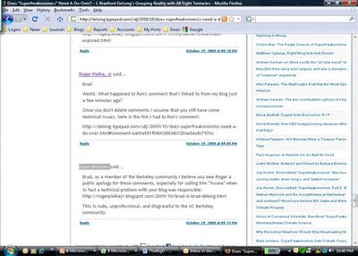 My default is that everyone's comments are automatically published. (I do prune them later, if I think they are actively misleading. But I don't refuse to post.)The screen shot below from DeLong's blog last evening (taken by an observer and sent to me by email this morning, thanks D!), do the comments look "actively misleading" to you? They are polite and on point. Yet they were immediately deleted by DeLong. Several other similar comments were "pruned" as well. Hey, it is DeLong's blog and he can run it like he wants, but to put forth a bald lie and then accuse me of "insanity" for pointing out that he actually deletes comments (when he does) takes chutzpah.